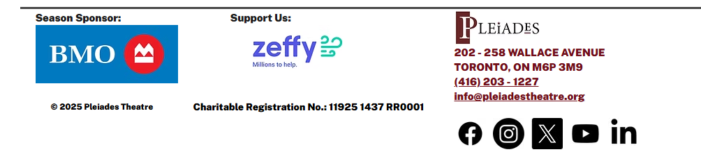 Pleiades Theatre acknowledges the generous support of our donors, the Canada Council for the Arts, Ontario Arts Council, Toronto Arts Council, The Catherine and Maxwell Meighen Foundation, The Norman and Margaret Jewison Charitable Foundation, The McLean Foundation and our Season Sponsor BMO.